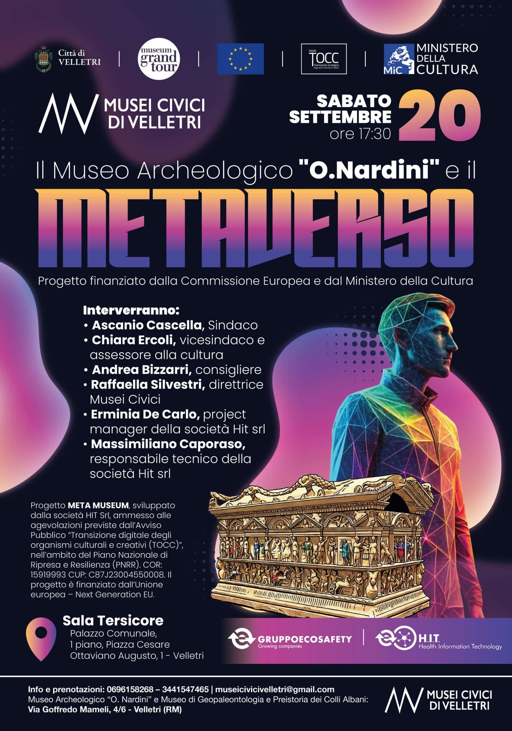 Sabato 20 settembre, alle ore 17.30 nella Sala Tersicore del Palazzo Comunale di Velletri, è stato presentato ufficialmente il progetto META MUSEUM, sviluppato da H.I.T. Srl con il supporto del Gruppo Ecosafety e finanziato dal Ministero della Cultura e dalla Commissione Europea nell’ambito dell’Avviso “Transizione digitale degli organismi culturali e creativi (TOCC)”.